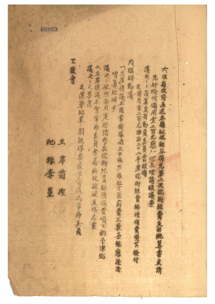 三,縂務組簽呈:准縣政府函以據舊建徳區抗衞𦀇費勸募委員㑹副